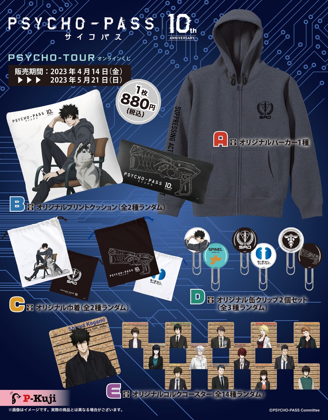 Pアニメストアの運営会社 フィルタ―・インクは【P-Kuji ぴーくじ】のオンラインくじシステムサービスにおいて、4月14日(金)昼12:00より『PSYCHO-PASS サイコパス』「PSYCHO-TOURオンラインくじ」を発売いたします。