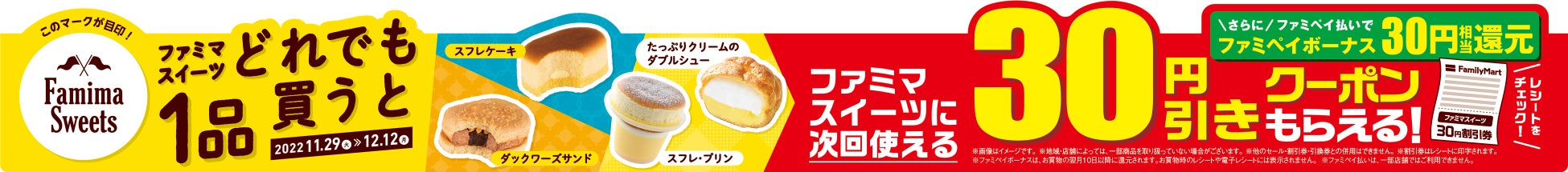 期間中、「Famima Sweets」各種をご購入いただくと、「Famima Sweets」各種にご利用いただける30円引クーポンがレシートに印字されます。