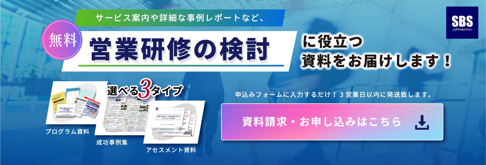 弊社のプログラム導入で成果をあげられたお客様の成功事例集や、組織の活性化・自律的成長を促すアセスメントの資料など、営業研修の検討に役立つ資料をお届けします。