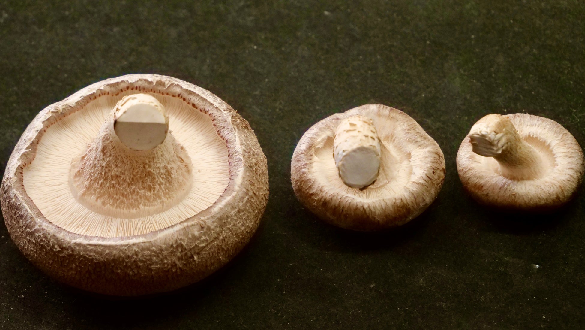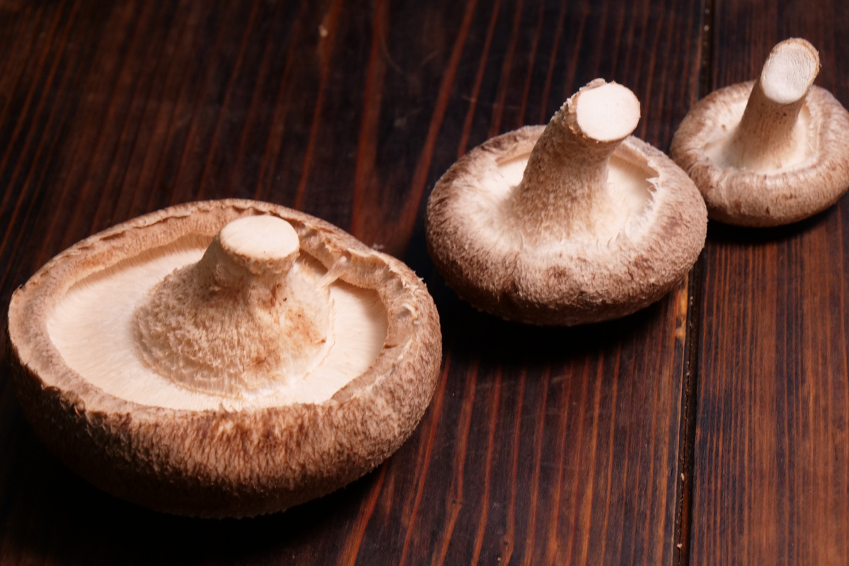 (左:黒椎茸、中:通常肉厚とされる椎茸、右:一般的な椎茸)