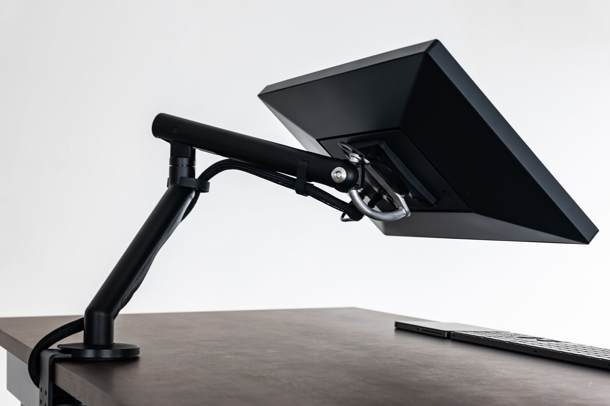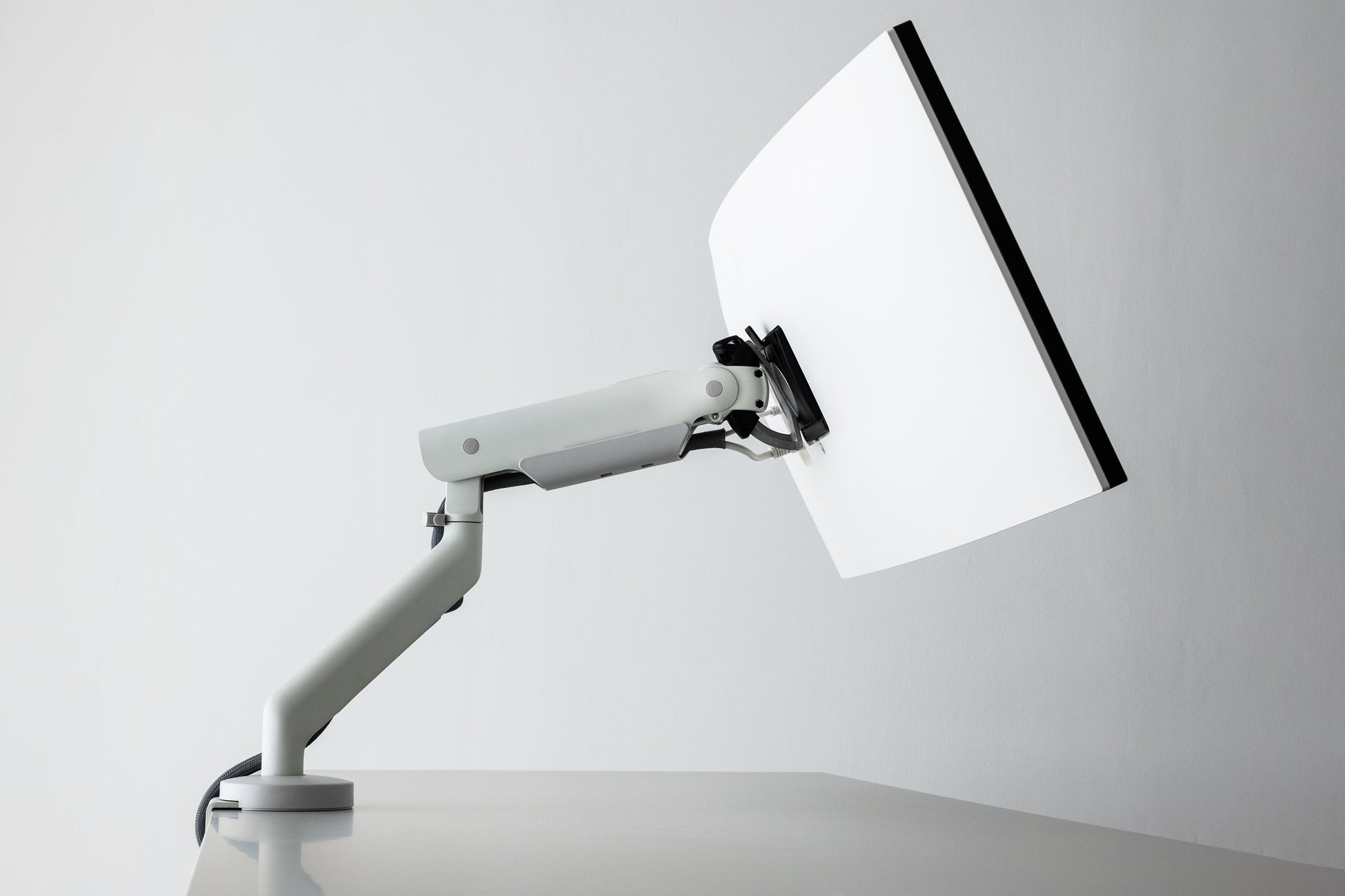 2023年10月に新発売した、ハイエンドモデルのモニターアーム“Flo X Monitor Arm”。重量3kgから18kgと幅広いサイズのモニターをサポート。重量のあるウルトラワイドや湾曲型モニターにも対応し、正しく調整することで、指先だけでスムーズに操作が可能です。