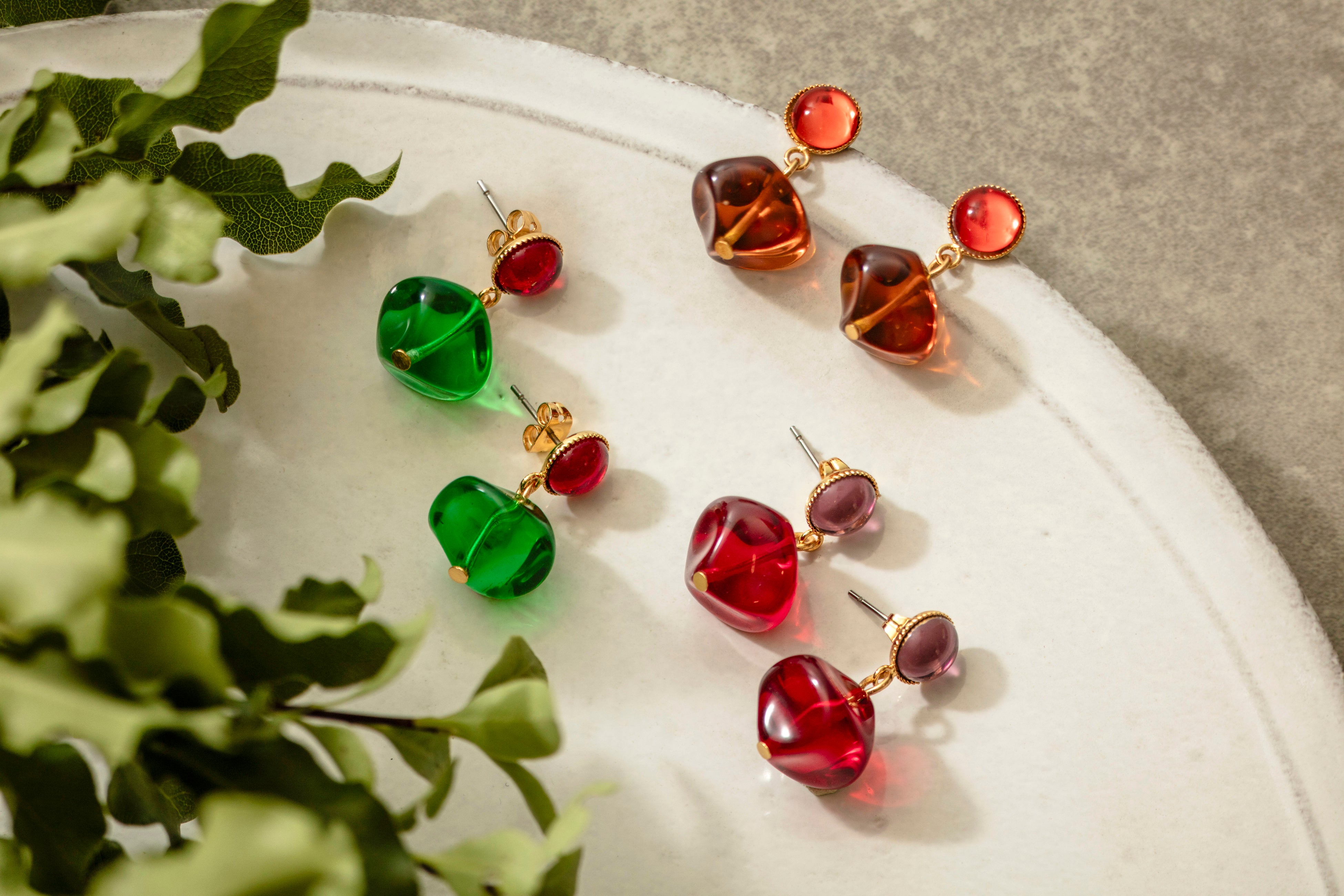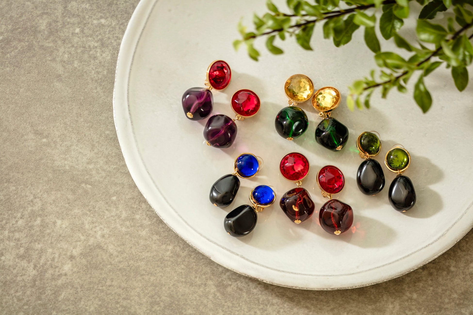 ⽣き生きとした透明感と光のゆらぎが人気の、まるでキャンディのような「バイカラーガラス」シリーズに、新たな配色が加わりました。ホリデーシーズンらしい鮮やかな色の組み合わせが、顔まわりをぱっと明るく照らし、着こなしに季節感と華やぎを添えます。揺れ感が醸し出す柔らかな光をお楽しみください。ピアス・イヤリングで展開し、ギフトにも最適なアイテムです。