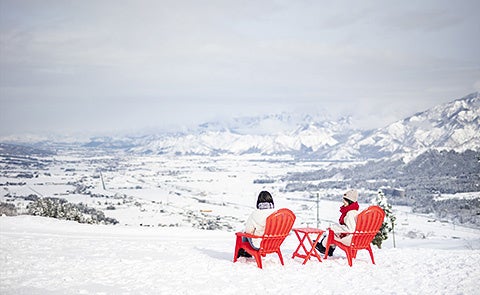 雪のテラスからは、真っ白に雪化粧をした魚沼平野と越後三山を望む大パノラマをお楽しみいただけます。