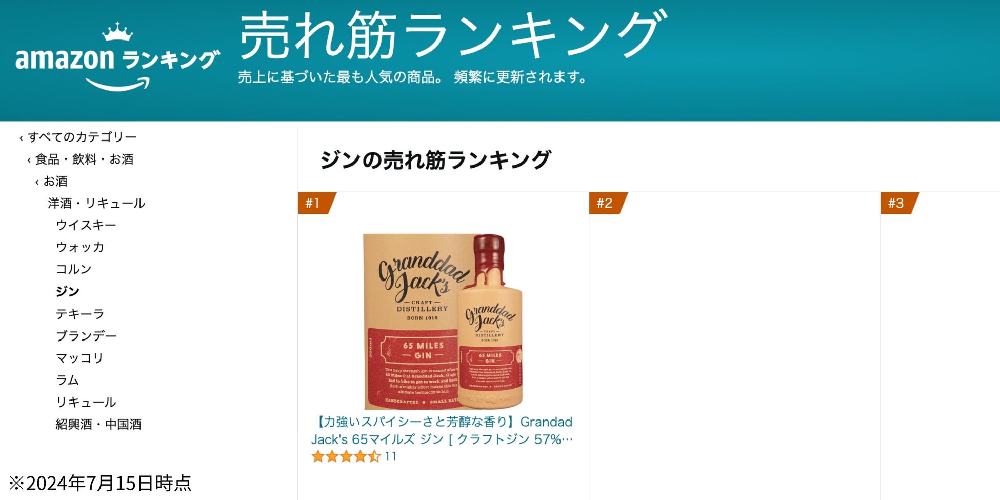 2024年7月には人気のお酒系YouTuber「プロのお酒塾 マスターイエツネ」チャンネルにてGranddad Jack'sのジンが紹介され、同時期に開催されていたAmazonプライムデー先行セール期間中に、ジンカテゴリ売れ筋ランキング1位も獲得しました。