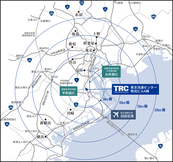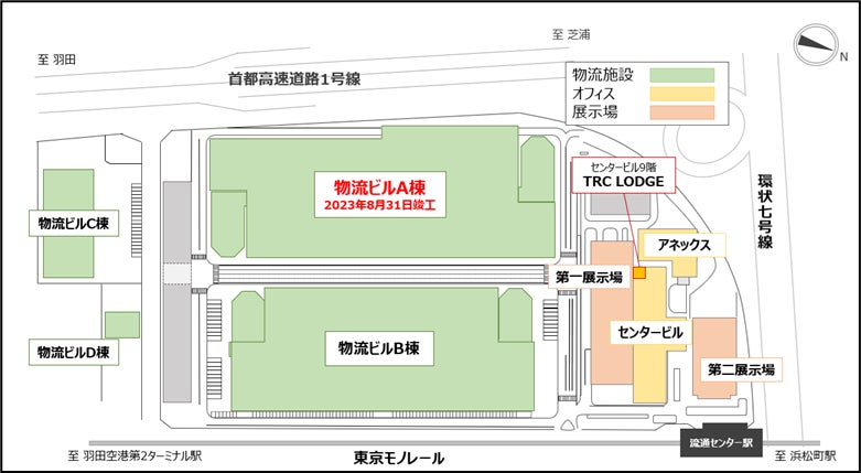 TRCは1967 年から 50 年以上に亘り東京・大田区平和島にて物流施設(総延床面積:約 12 万坪)を運営・管理しており、当社敷地内施設の再開発第二弾として地上 7 階建(1~6階:倉庫+屋上駐車場)・免震構造のマルチテナント型物流施設「物流ビル A 棟」(最小約 144 坪~1 フロア約 7,800 坪、延床面積約 61,000坪)が 2023 年 8 月 31 日に竣工し、ご契約済テナントが続々とご入居を開始しています。