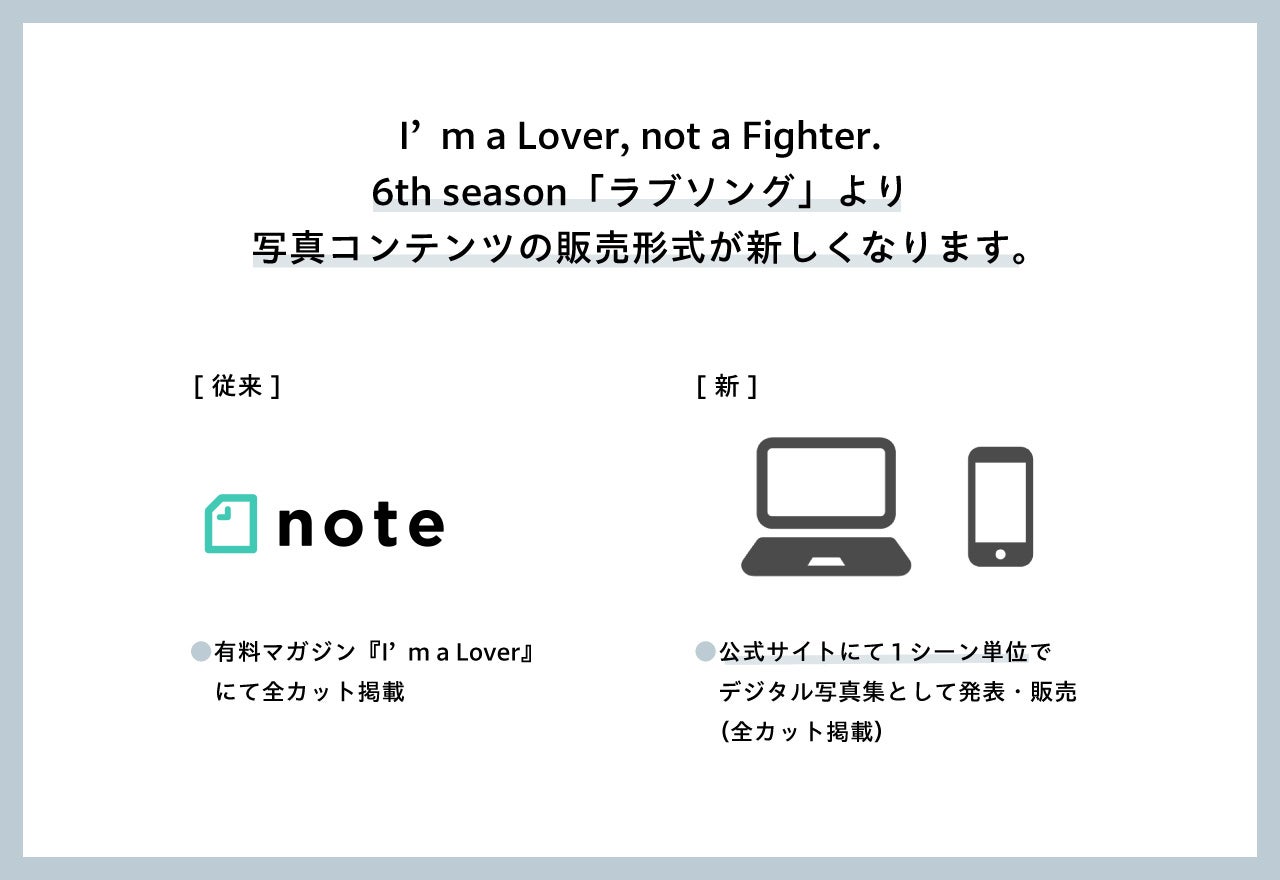 これまでI’m a Lover, not a Fighter.の作品を、noteの有料マガジンにて発表してまいりましたが、この度、6th season の作品より、「I’m a Lover, not a Fighter.」公式サイトにて、デジタル写真集という販売形式に変わります。また、9月15日(木)より6th season「ラブソング」scene1のデジタル写真集の販売を開始いたします。