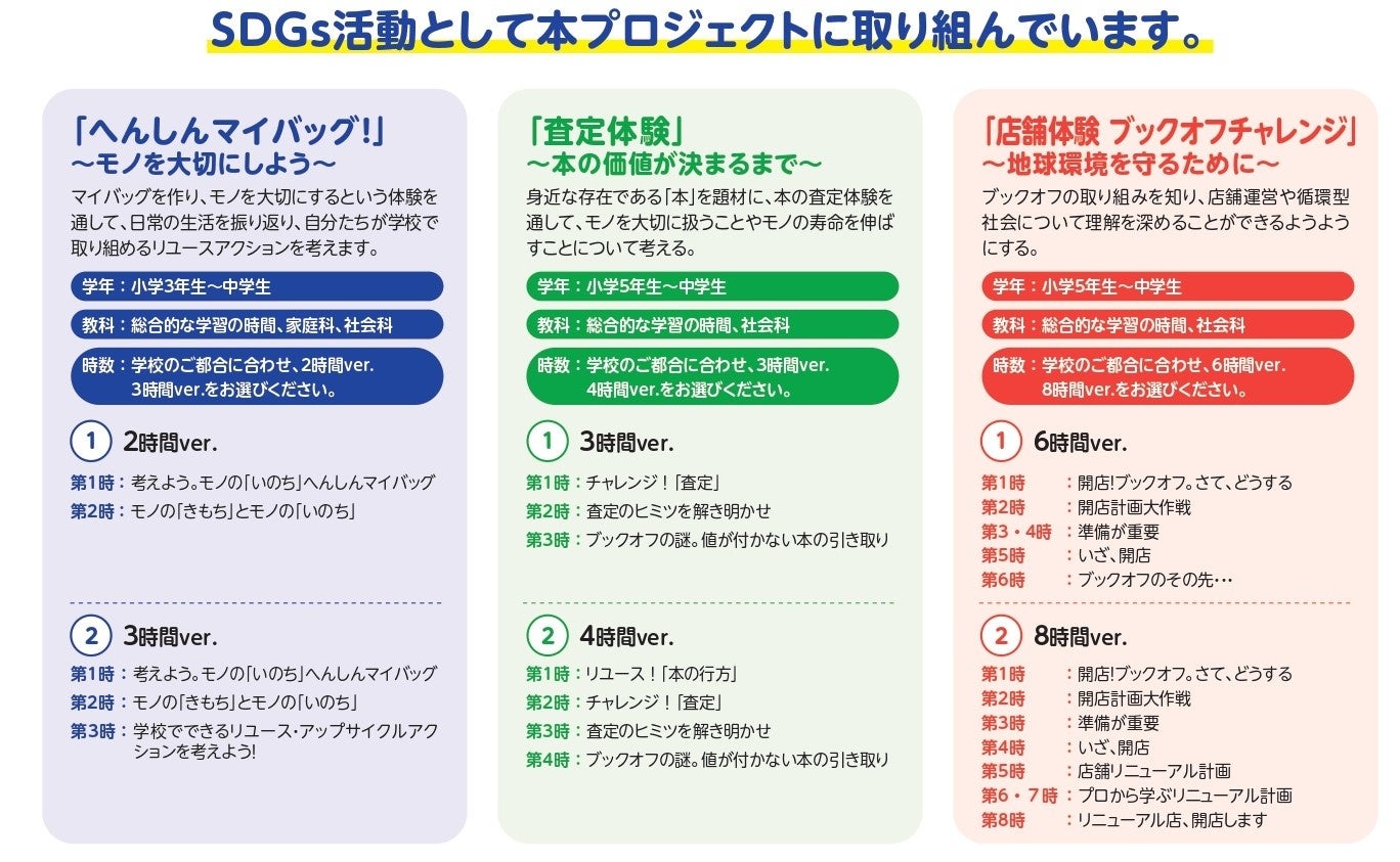 4年目を迎える本プロジェクトは、累計約9,000人以上の児童が体験した人気のプログラムとなっています。「マイバック作り」「査定体験」「店舗体験」の3つのプログラムから学校の事情に合ったものを、お好きな時数で実践していただけます。教材は全て無料です。全国の小中学校、学童、フリースクールなどのお申し込みをお待ちしています。