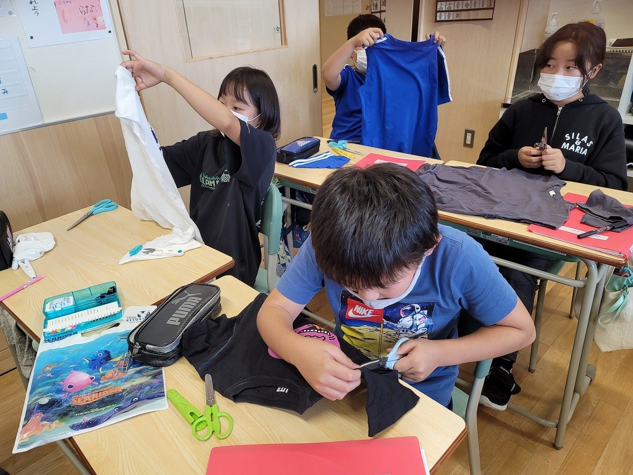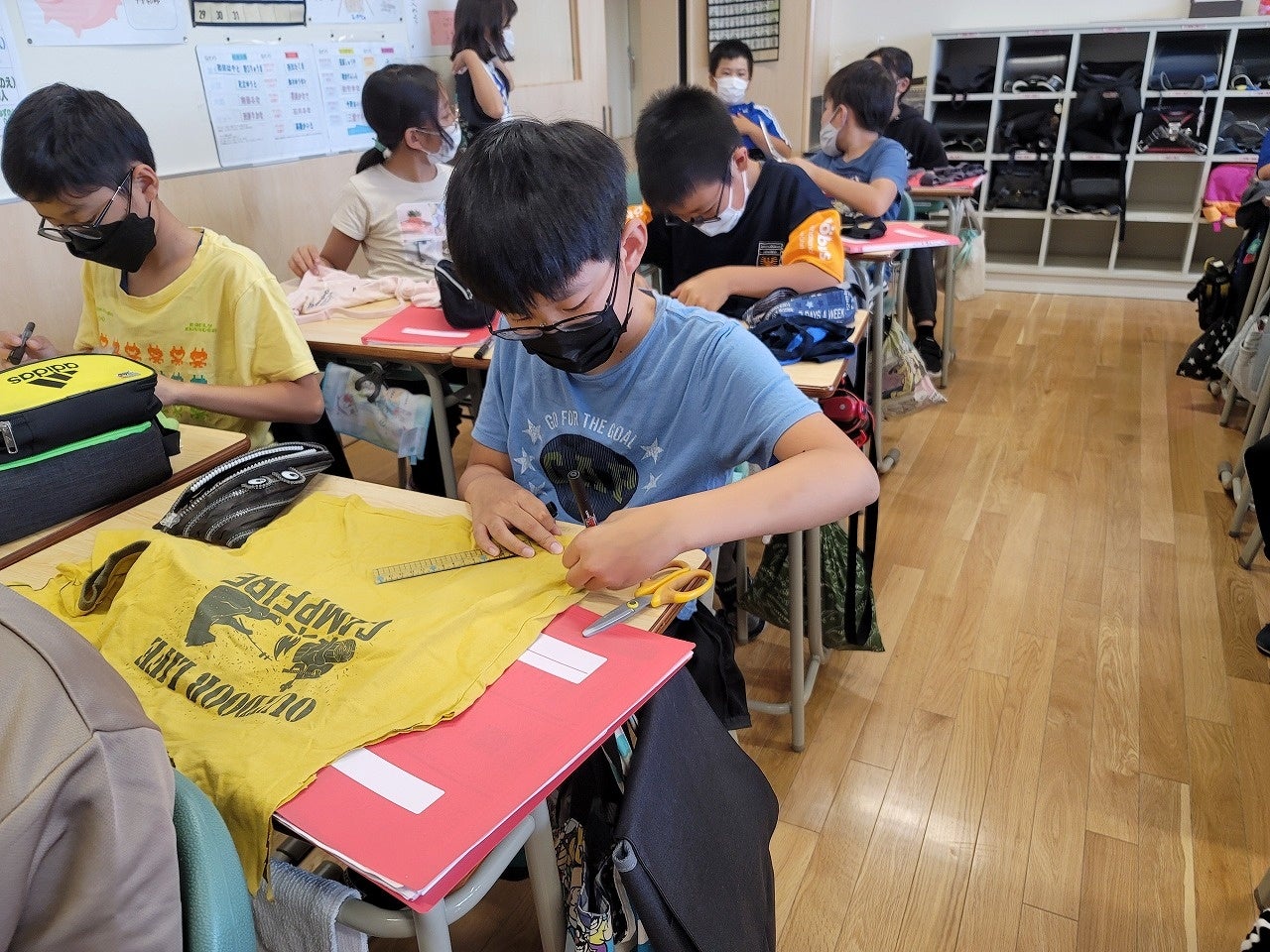 ・3Rについての理解を深めた後、「モノの寿命を伸ばそう」をテーマに、家にある着なくなったTシャツを持ち寄り、一人一つずつ、Tシャツをリメイクしてマイバック(エコバック)を作ります。