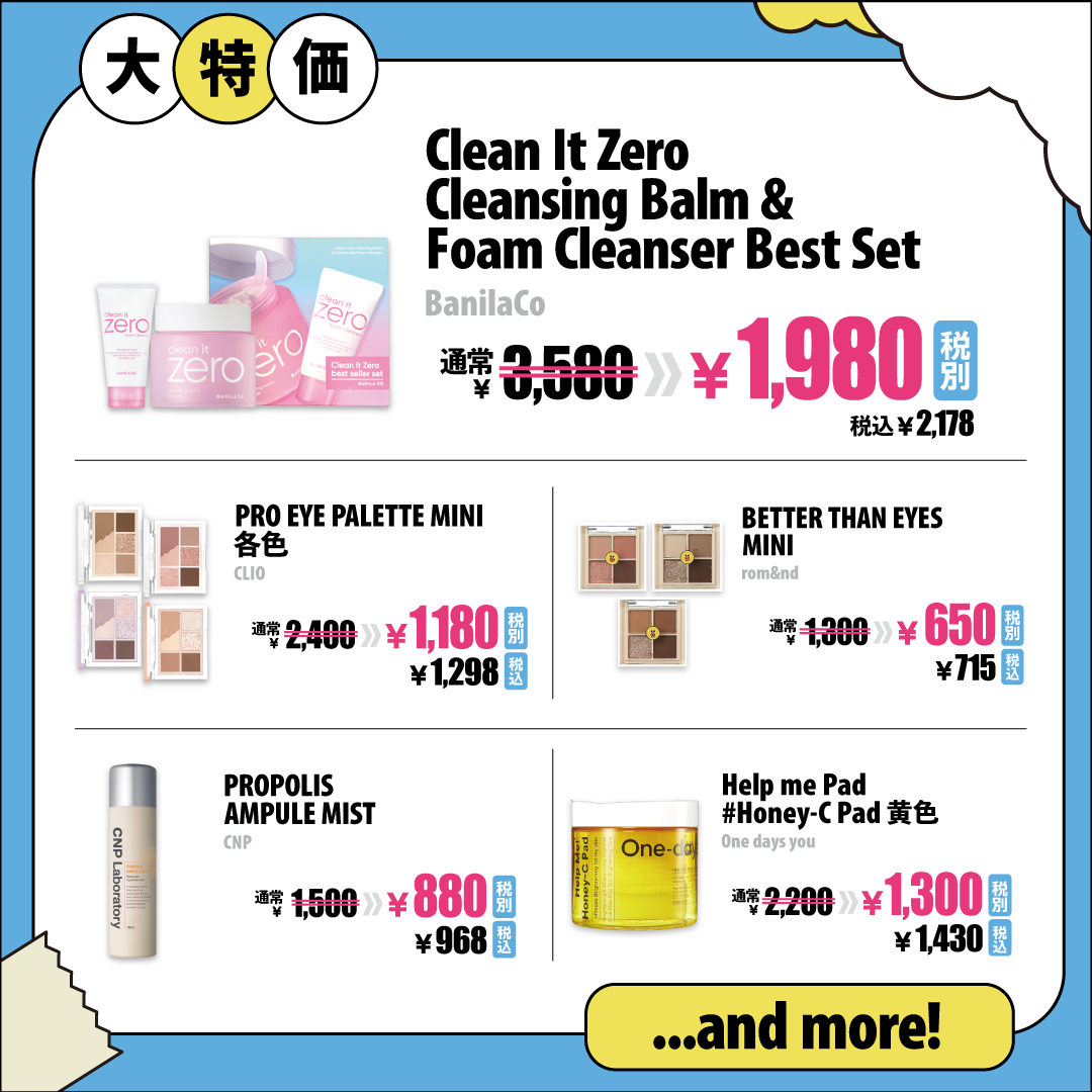 多数の韓国コスメ・スキンケアを扱うKOLLECTIONならではの企画として、定番のコスメから今話題のスキンケア用品までを驚きの低価格でご提供いたします。定価から20%オフのものや、50%オフのものまで、お安くゲットできる機会となっています。販売予定のコスメブランドは、「CLIO」や「rom&nd(ロムアンド)」などの人気ブランドはもちろん、「BanilaCo」「CNP」などの定番韓国スキンケアブランドまで多数取り揃えております。