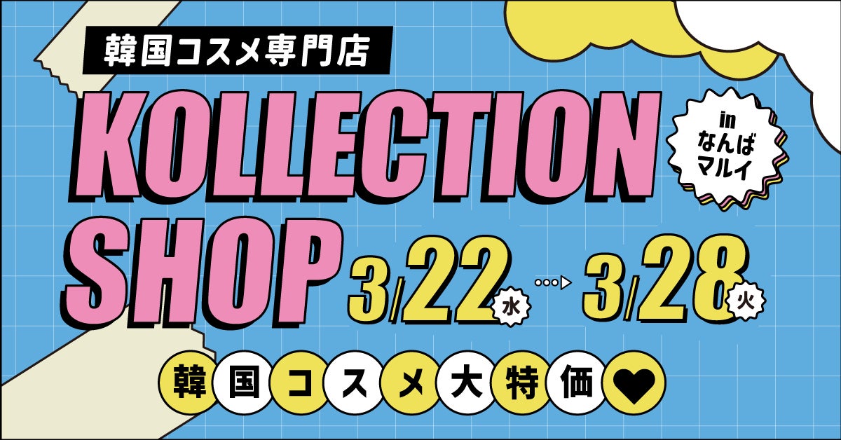 韓国コスメ専門店「KOLLECTION」の期間限定ショップがなんばマルイにて3/22(水)~3/28(火)にオープンします。韓国コスメ・スキンケアをセール価格で購入できるほか、購入者への豪華特典も