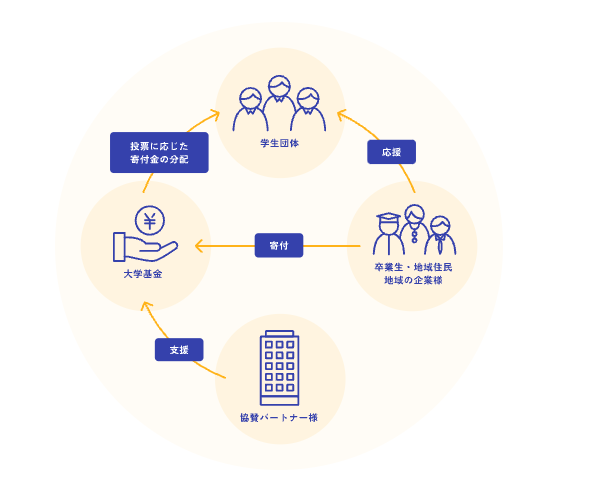 「Giving Campaign 2023」は、各大学の支援者ネットワークの拡大・活性化と寄付文化醸成を目的として行われました。本取り組みにご賛同いただいたパートナー企業から募った支援金を、イベント期間中に各大学の学生団体(研究室・部活動・サークル等)が集めた応援数などに基づいて、大学基金および学生団体に分配する取り組みです。また、イベント期間中には学生団体を応援する個人からの寄付も可能となっておりました。