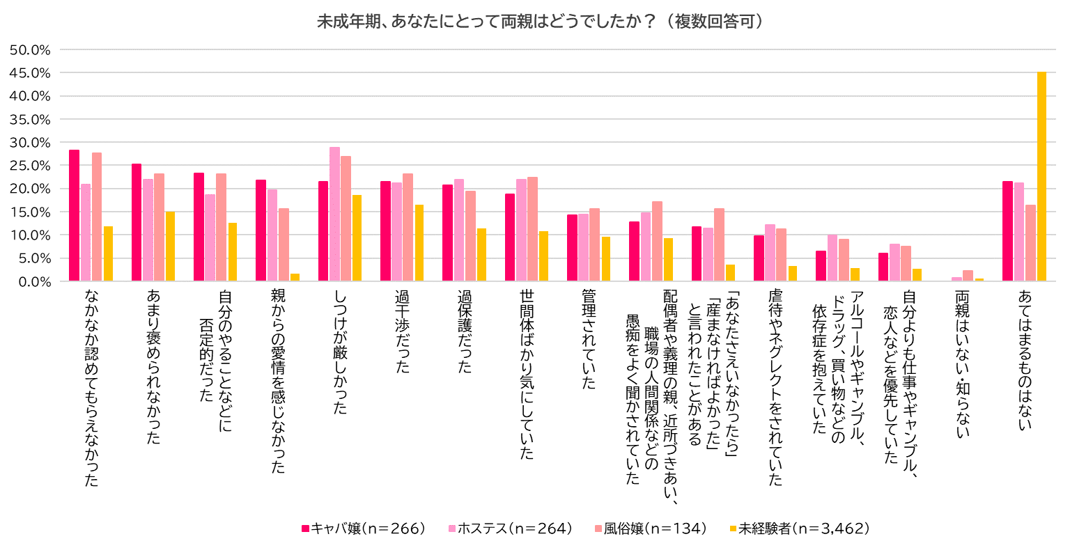 今度は、彼女たちの両親が毒親だったかどうかを調査するために、「未成年期、両親はどうだったか?」尋ねました。どの項目も夜職経験者は未経験者より多く、特に「親からの愛情を感じなかった」(キャバ嬢:21.8%、ホステス:19.7%、風俗嬢:15.7%、未経験者:1.7%)や「『あなたさえいなかったら』『産まなければよかった』と言われたことがある」(キャバ嬢:11.7%、ホステス:11.4%、風俗嬢:15.7%、未経験者:3.6%)、「虐待やネグレクトをされていた」(キャバ嬢:9.8%、ホステス:12.1%、風俗嬢:11.2%、未経験者:3.3%)では未経験者よりも夜職経験者の方が明らかに多いことがわかりました。