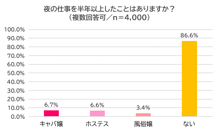 「夜の仕事(夜職)を半年以上したことがあるか?(但し、体験入店は除く)」尋ねたところ、86.6%が「ない(以下、未経験者)」と回答したものの、13.4%が「キャバ嬢」(6.7%)、「ホステス」(6.6%)、「風俗嬢」(3.4%)などの経験があることがわかりました。