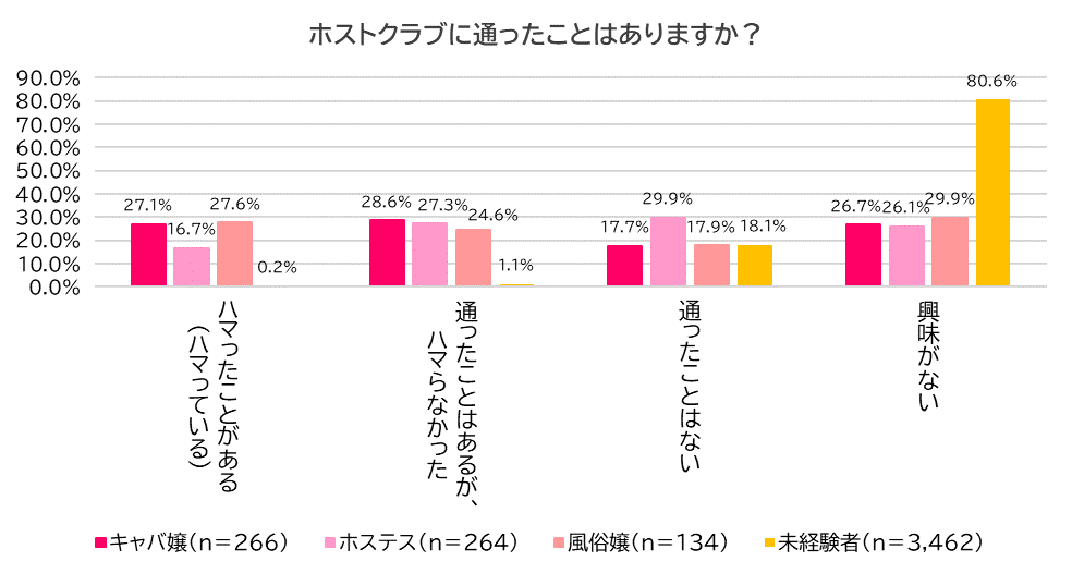 ①夜の仕事未経験者の99.8%はホストにハマることがない。一方、キャバ嬢経験者の27.1%、ホステス経験者の16.7%、風俗経験者の27.6%がハマる。