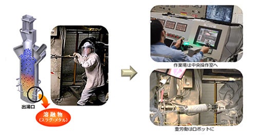 「リアルタイム制御技術」と「リアルハプティクス技術」を実装した汎用ロボット導入により、現場から隔離された快適で安全な中央操作室から、操業状況の監視作業と並行しつつ遠隔操作により、出湯口の付着物除去作業をごく軽い力で行うことが可能となり、従来の炉前作業の省力化に大きく貢献しました。