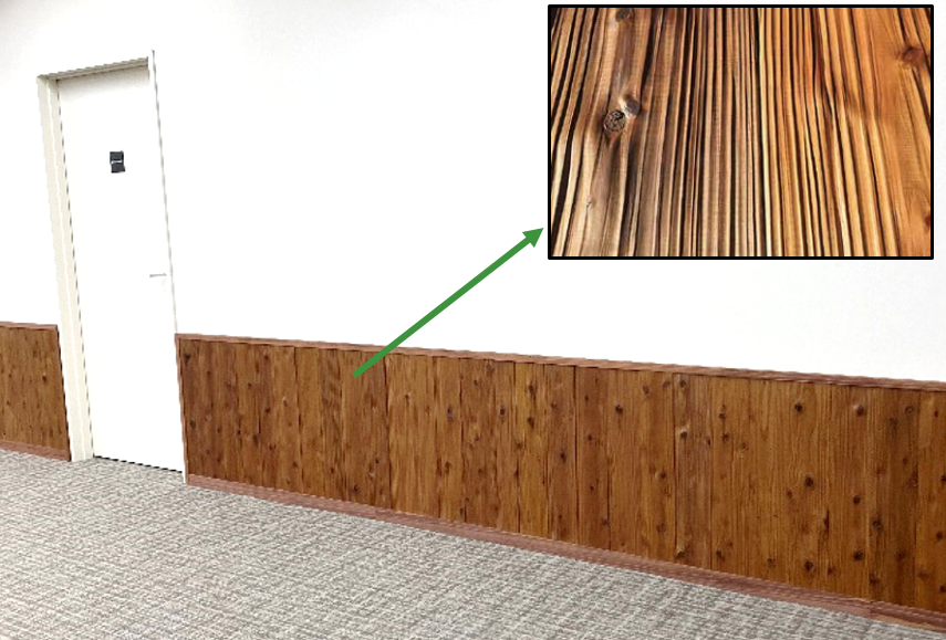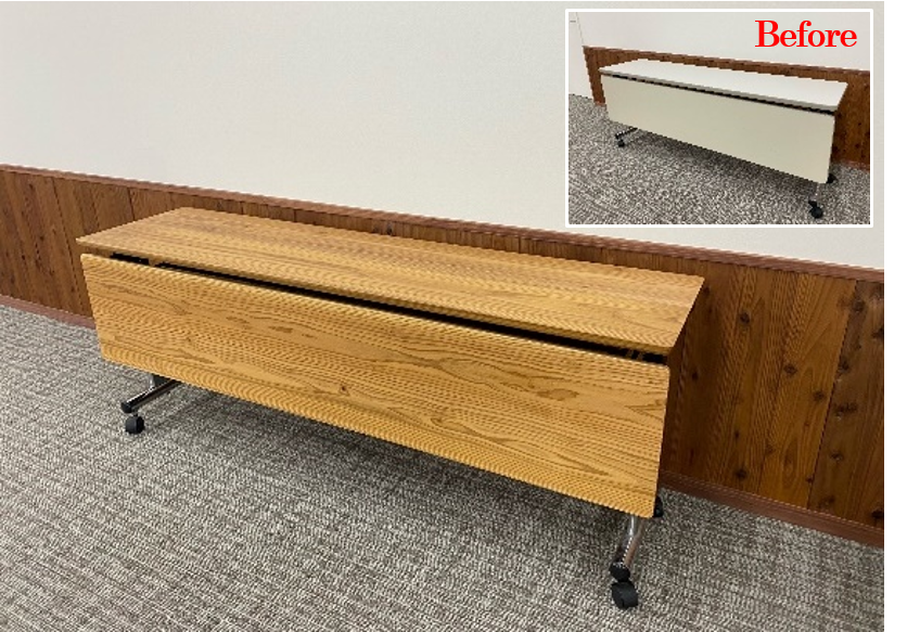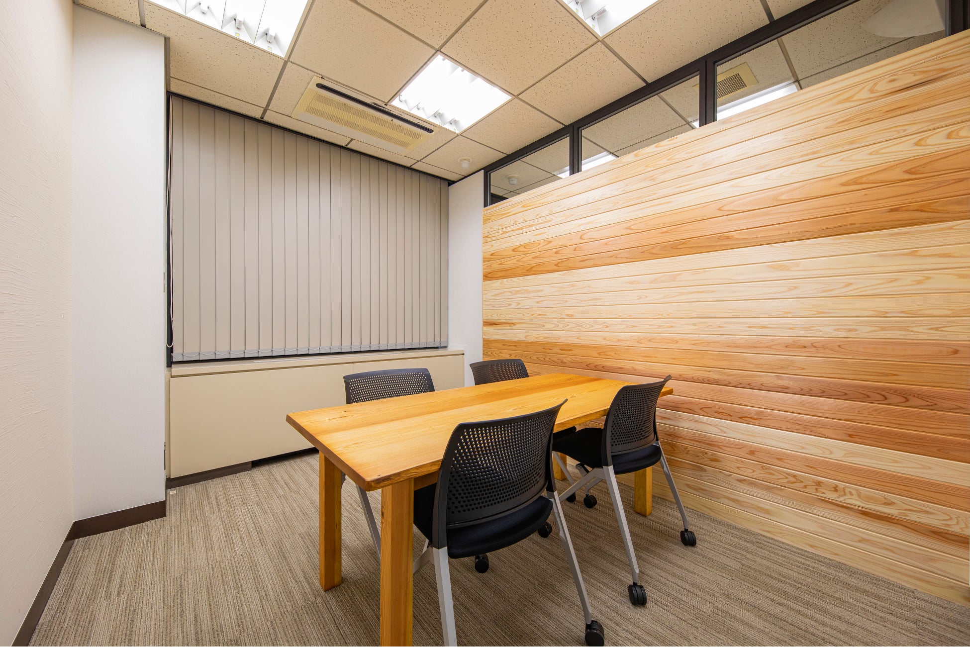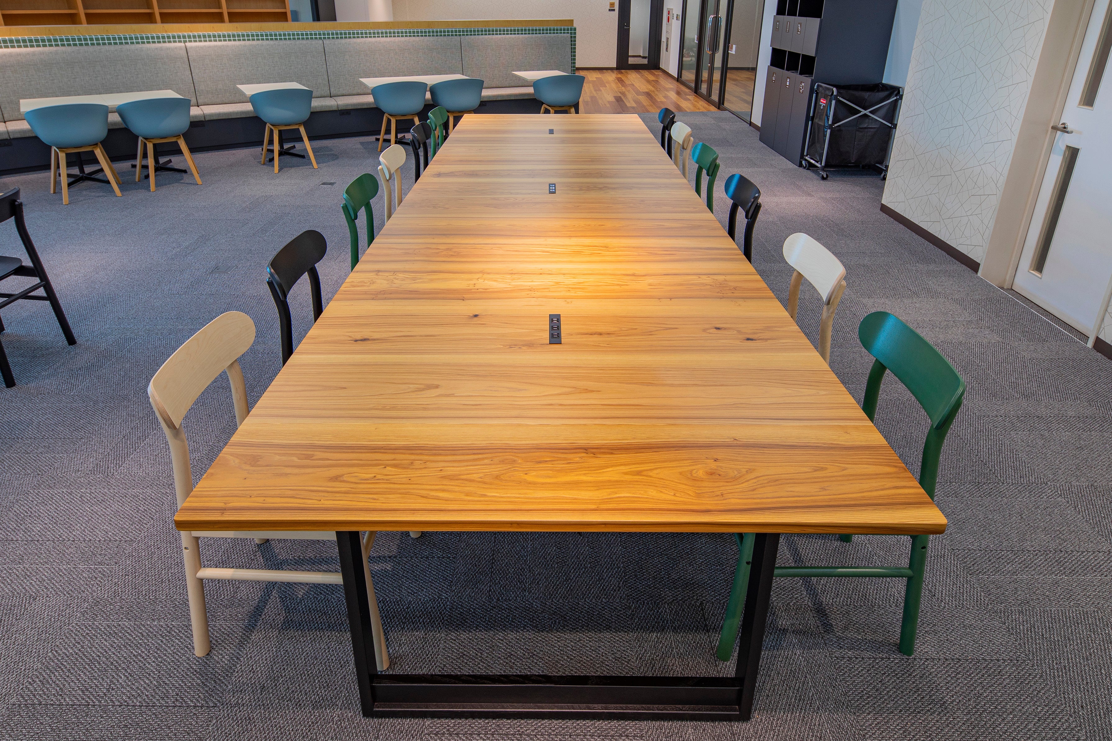 接客スペースである2階については、6部屋の接客スペース及び受付をリニューアルいたしました。各部屋にはそれぞれ6つの異なる樹種を使用しており、木目や香り、触り心地など、それぞれの樹種で異なる質感を感じていただける体感ルームとしました。受付カウンターには、ヒノキのスリット材を採用し、背面のパーテーションにはオニグルミとヤマザクラの2種類の国産広葉樹を、壁面には木曽五木の一つであるコウヤマキを施しています。また、大会議室の会議用テーブルは、既存の天板・幕板を「Gywood®」に張り替える「テーブルリノベーション」を実施しました。既存家具を有効活用しながら、素材の手触り・使用感をお試しいただけるほか、新たな木質化の可能性をご提案します。