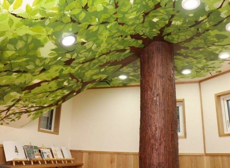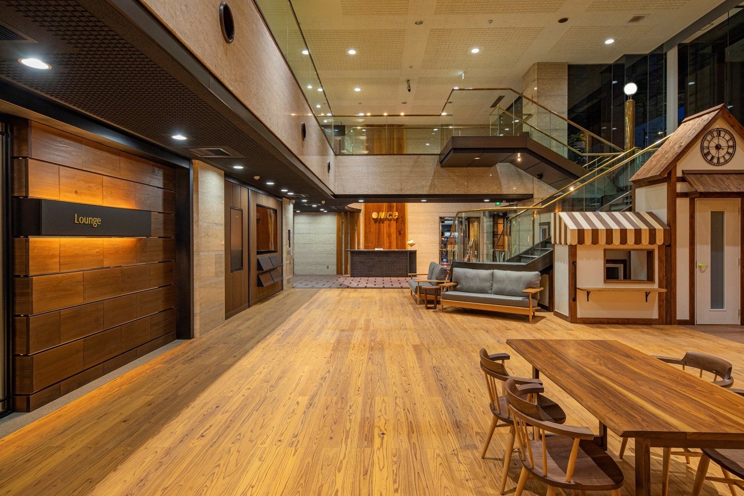 具体的には、お客様をお迎えする1階エントランスホール及びロビーについては、スギを随所に活用いたしました。受付背面に、高さ6mの天井までスギの大径木を施したほか、約140㎡に及ぶロビーのフローリングには当社のオリジナル商材である、飫肥杉の赤身材を活用した「Gywood®」を使用し、美しい木目とともに、優しく落ち着きのある空間といたしました。更に、ロビーに新設したキッズハウスには、当社が供給する一戸建住宅の標準仕様であるオリジナル金物工法「パワービルド工法」や、国内で唯一当社グループが製造している木質繊維断熱材の「ウッドファイバー™」を採用しており、当社の商品性能を体感していただく場として活用いたします。