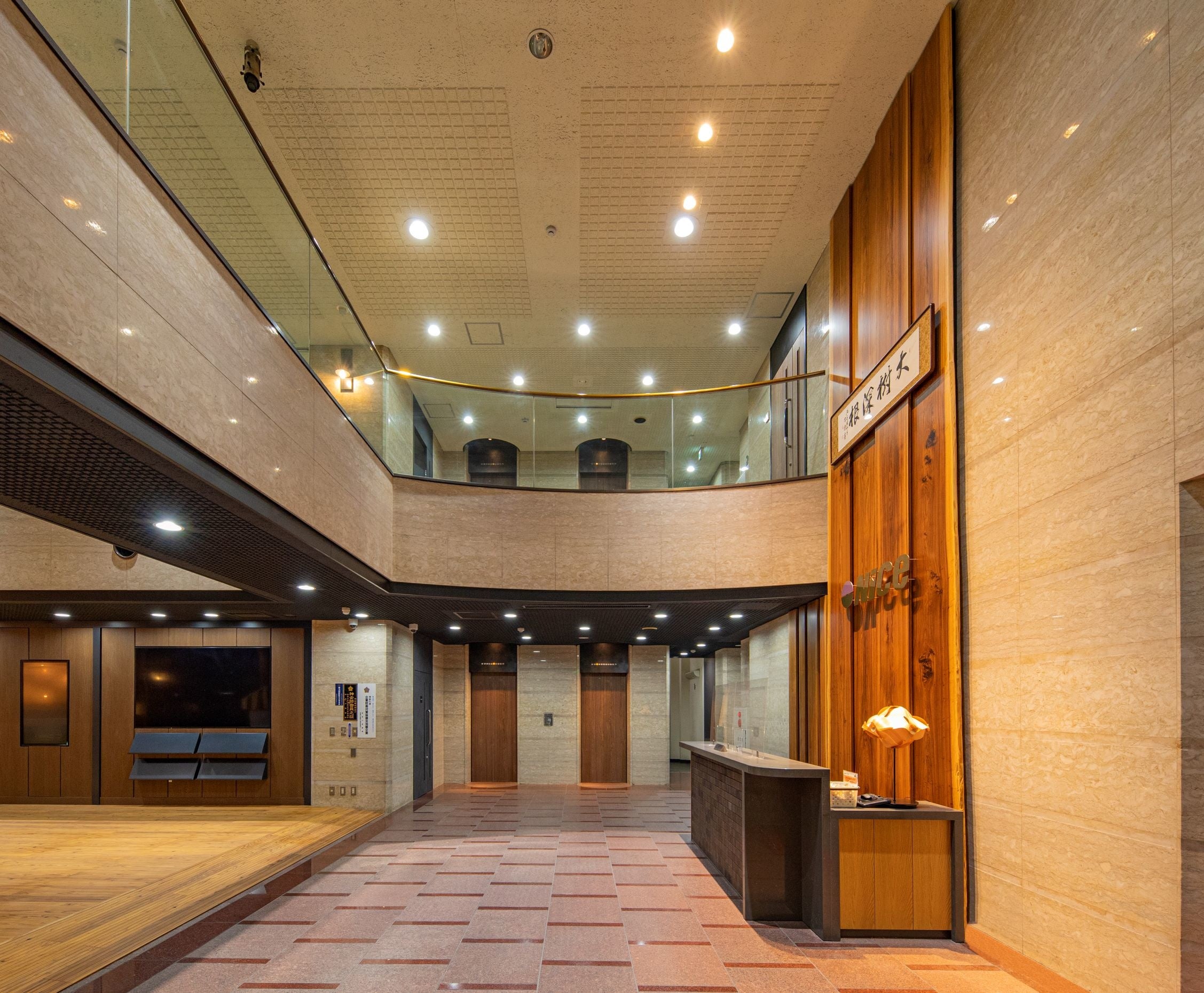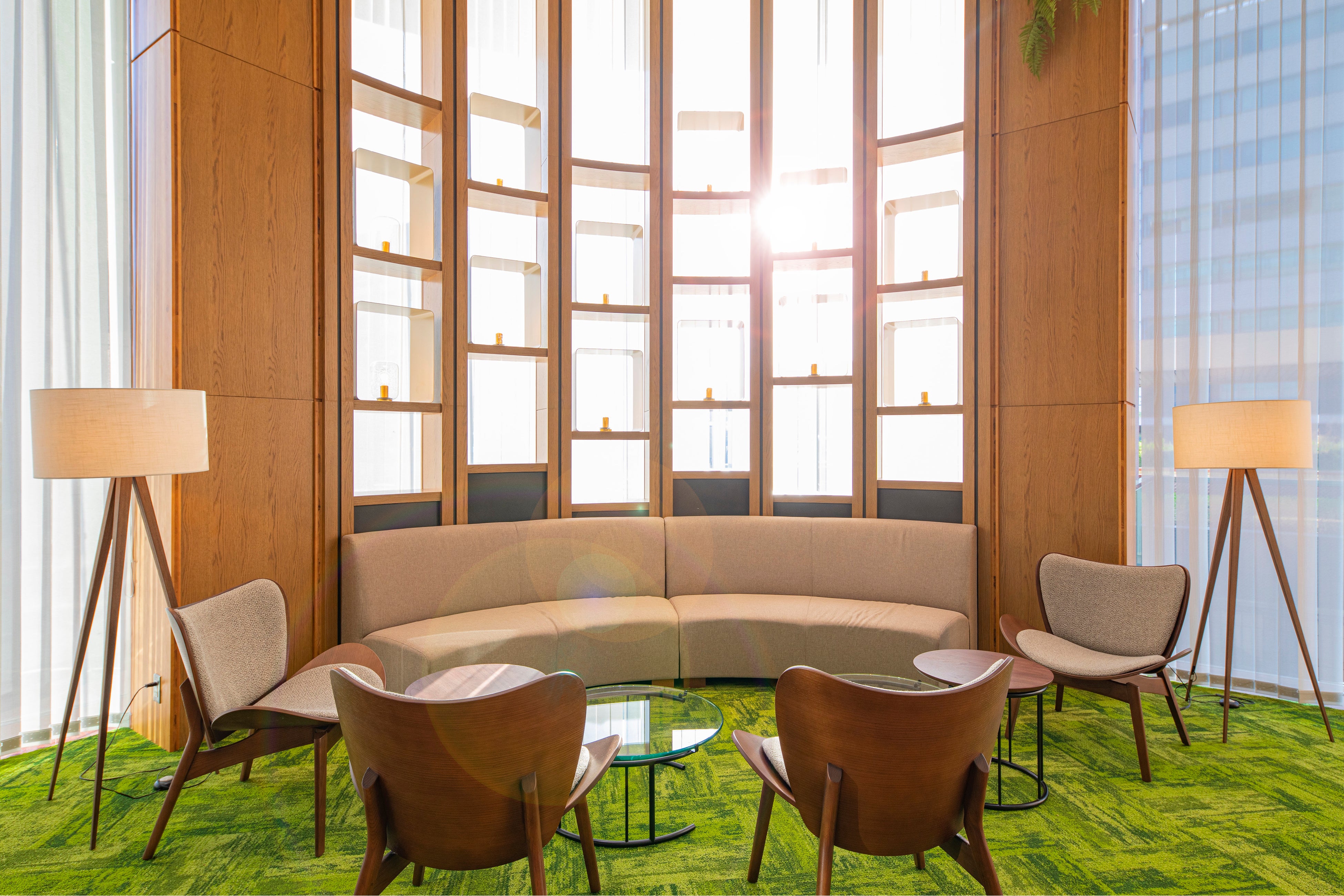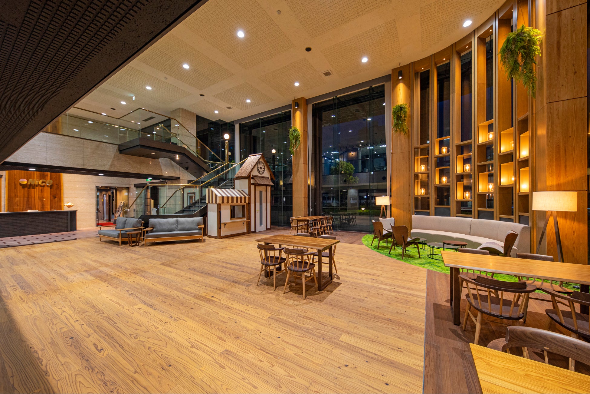 ロビーでは、当社オリジナル商材の「Gywood®」と、老舗家具メーカーである柏木工株式会社(本社:岐阜県高山市、社長:関 道朗)とのコラボレーションにより実現したオリジナルのテーブルとソファがお客様をお迎えします。