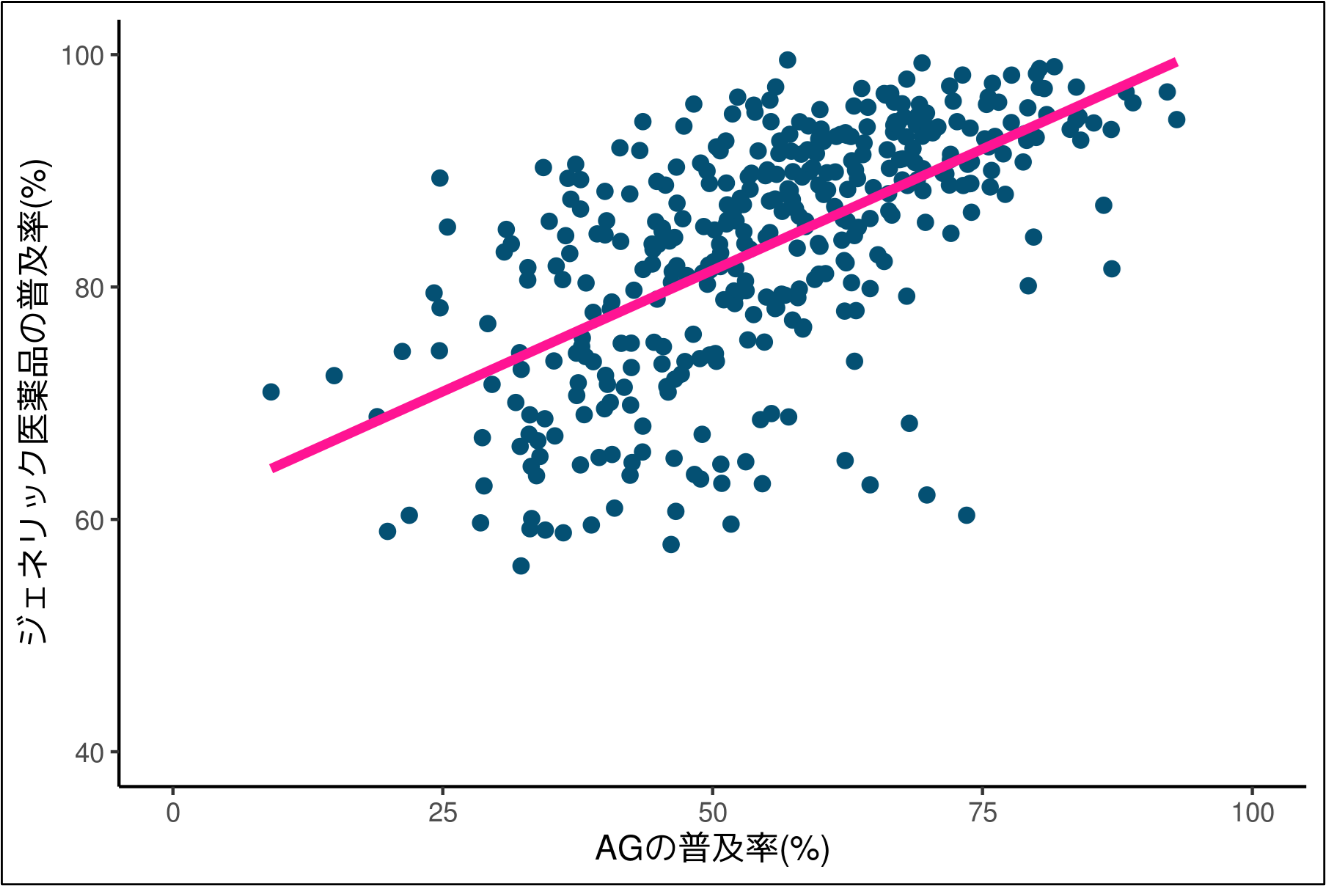 当社のレセプトデータから一部の医薬品に対してAGとジェネリック医薬品の普及率を分析したところ、AGがジェネリック医薬品普及を促進する結果が得られました。この結果よりAGの普及がジェネリック医薬品の普及に対して効果的である可能性が示唆されました(図1参照)。