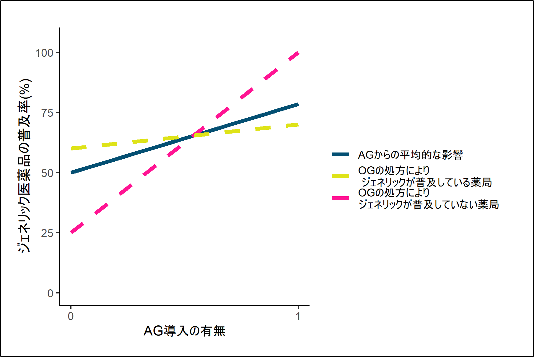 上図では、OGの処方によりジェネリック医薬品普及率が高い薬局(黄破線)とジェネリック医薬品普及率が低い薬局(赤破線)について、AGを採用することがジェネリック医薬品普及率に与える影響を表しています。