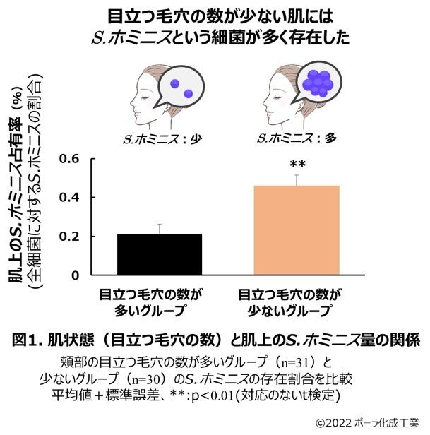 1.肌の状態が良い人はS.ホミニスが肌上に多く、S.ホミニスが毛穴等の改善効果を有することを発見