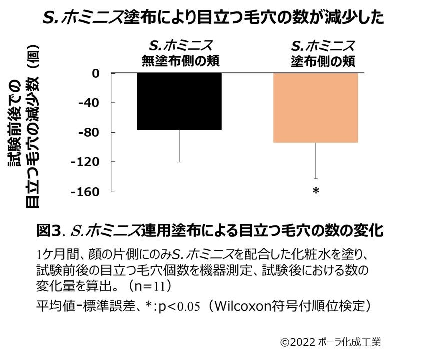 次に、S.ホミニスが実際に肌を改善するのか明らかにするため、S.ホミニスを含む化粧水を頬部に1ヶ月間塗り、塗らなかった場合と比較解析しました(図2)。その結果、「目立つ毛穴の数(図3)」「メラニン量」「シワ本数」に改善が認められました。肌上のS.ホミニスが肌に良い影響を与える細菌であることが証明されました。