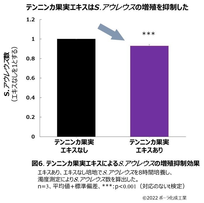 S.ホミニスの増殖を促す成分を探索した結果、ユズ果実エキスが有効であることを見出しました(図5)。また、実は肌には、S.ホミニスと同じブドウ球菌の仲間でありながら、肌状態に悪い影響を与える細菌(S.アウレウス※3)が存在します。 そこで、肌状態をさらに良くするために、肌状態の改善に有効なS.ホミニスの増殖は抑制することなく、S.アウレウスの増殖は抑制させることのできる成分を探索しました。その結果、テンニンカ果実エキスにそのはたらきがあることを見出しました(図6)。