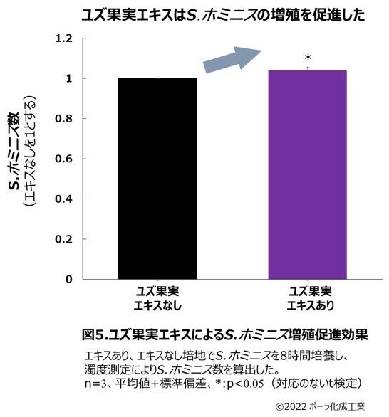 日常的に、直接S.ホミニスを肌に塗り続けることは、保管方法やコストの面で負担になります。そこで、各個人の肌上に存在するS.ホミニスを増やすことを考えました。さまざまな成分を探索した結果、ユズ果実エキスが有効であることを見出しました(補足資料3 図5)。さらに、S.ホミニスの増殖は抑制することなく、肌に悪影響を与えることが報告されているS.アウレウスの増殖を抑制するエキスも明らかにしました(補足資料3 図6)。
