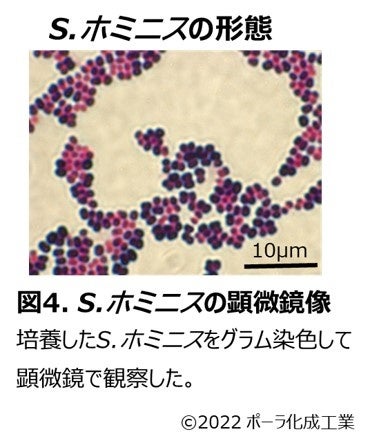 S.ホミニス(図4)は、ブドウ球菌の仲間の1種で、その名の通りブドウの房のような形状をしています。ほぼ全ての人の肌にいると言われており、頬だけでなく、全身の肌に存在します。近年では、アトピー性皮膚炎での治療研究でもS.ホミニスが良いはたらきを持つ可能性が示され、注目が集まっています。美肌に寄与する細菌としては、これまでS.エピデルミディス(※2)という細菌に肌の水分量上昇やバリア機能改善効果があることが知られていました。今回の研究で、S.ホミニスも美肌に寄与する細菌であることが新たに示されました。