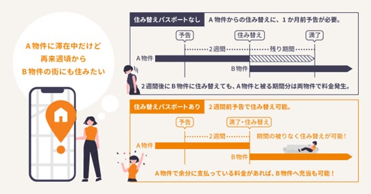 ・当初契約いただいたご利用期間を短縮し、他物件へ住み替えする場合、通常は1か月前までの告知が必要となりますが、「住み替えパスポート」を使えば2週間前までの告知で住み替えが可能となります。