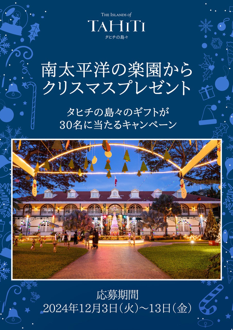フランス領ポリネシアに浮かぶ大小118の島々の観光促進を展開するタヒチ観光局(正式英語団体名:Tahiti Tourisme、最高経営責任者: ジョン-マルク・モスラン)は、2024年12月3日(火)から12月13日(金)12:00まで、タヒチ観光局公式Instagramアカウント(@tahititourismejp)にて「トロピカル・クリスマスギフトキャンペーン」を実施します。直行便の再開に伴い、本年は多くの日本人の皆様にお越しいただいたことへの感謝と、2025年の更なる発展を願い、タヒチの島々の香りや文化が詰まったギフトボックスを30名様にお届けします。