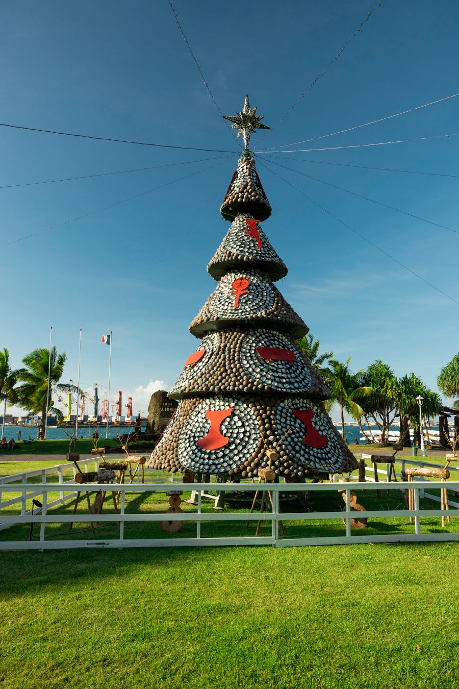 タヒチの島々でもクリスマスは祝われ、島中がホリデームードに包まれます。例えば、パペーテの市庁舎はイルミネーションで飾られ、パオファイ公園には高さ7メートルのユニークなクリスマスツリーが設置されます。このタヒチ特有のクリスマスツリーは、ココナッツやタヒチの海で育った黒真珠の母貝といった、自然の素材を活用して作られています。