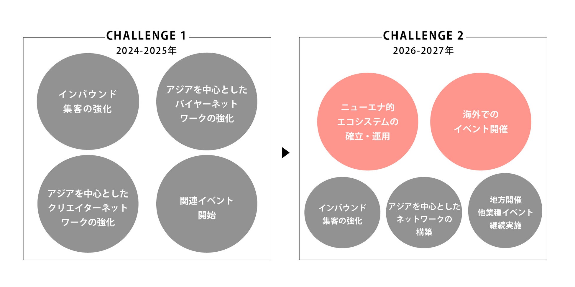 出展者であるクリエイターや中小企業のビジネスにポジティブな効果をもたらすため、コミュニティの拡大を行いながら、私たちは直近3年で以下のことに挑戦します。私たちが主催するプラットフォーム(NEW ENERGYや新イベント等のサービス)に参加することで、参加者の経済活動がより活性化することを目指します。
