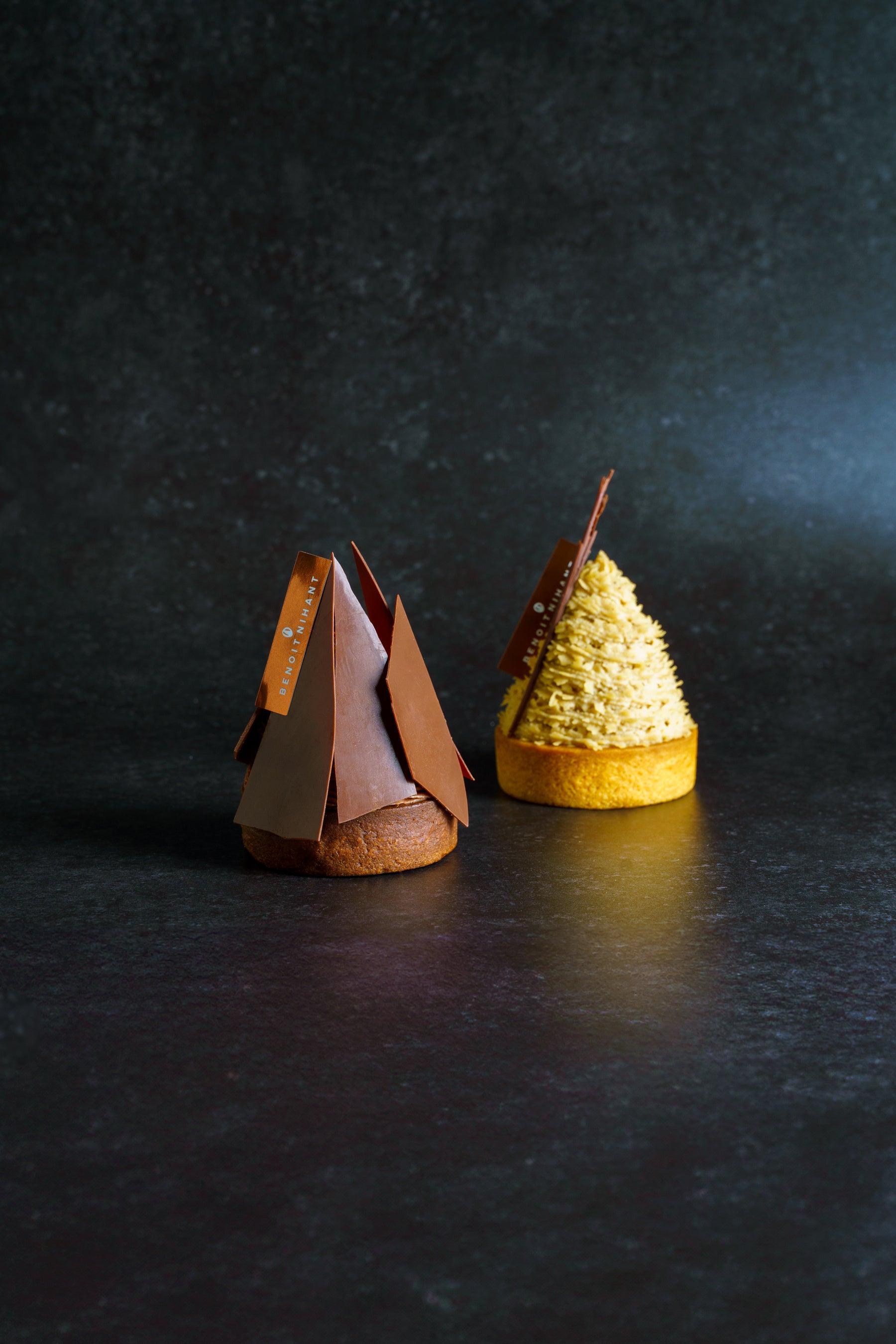「熊本県産栗のモンブラン」には、クリームの中に栗を丸ごと1粒、さらにグアテマラ産カカオ〈リオ ドゥルセ〉のガナッシュを忍ばせました。栗のやさしい甘みとチョコレートのコク、生クリームが調和した、ブノワ・ニアンらしい上質なひと品です。※両商品のクレームダマンド部にはラム酒を使用しています。