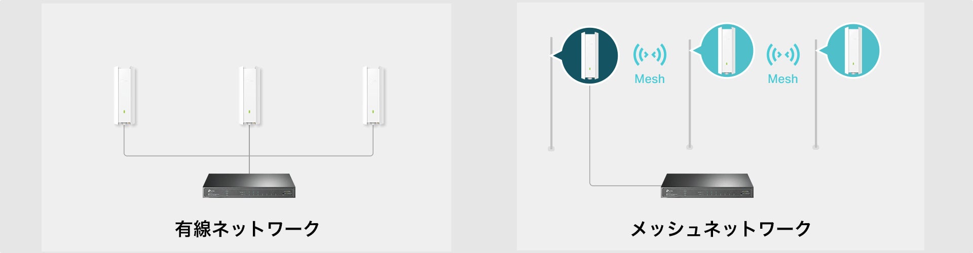 TP-Linkの法人向けAPの多くには、Omadaメッシュ機能が搭載されています。メッシュテクノロジーを活用すれば、配線工事の都合で諦めていたエリアにもWi-Fiを拡張することができ、より柔軟かつ低コストな展開が実現可能です。