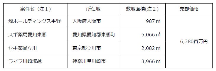 本公表における案件の売却先はいずれも地主リートであります。なお、地主リートは後述のとおり、2023年1月に計25物件を取得予定であり、当該25物件には、当社及び地主AMが、2019年にSMFLみらいパートナーズ株式会社及びエムエル・エステート株式会社(以下、総称して「大手リース会社」という)とそれぞれ締結した「販売用不動産(信託受益権を含む)の包括的な売買取引に係る枠を設定する基本協定書」に基づき、当社が大手リース会社へ売却した案件が含まれております。