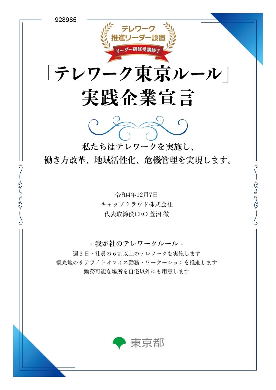 (宣言ページ:https://www.telework-rule.metro.tokyo.lg.jp/search/details.php?app_form_id=928985&s_keyword=%E3%82%AD%E3%83%A3%E3%83%83%E3%83%97%E3%82%AF%E3%83%A9%E3%82%A6%E3%83%89)