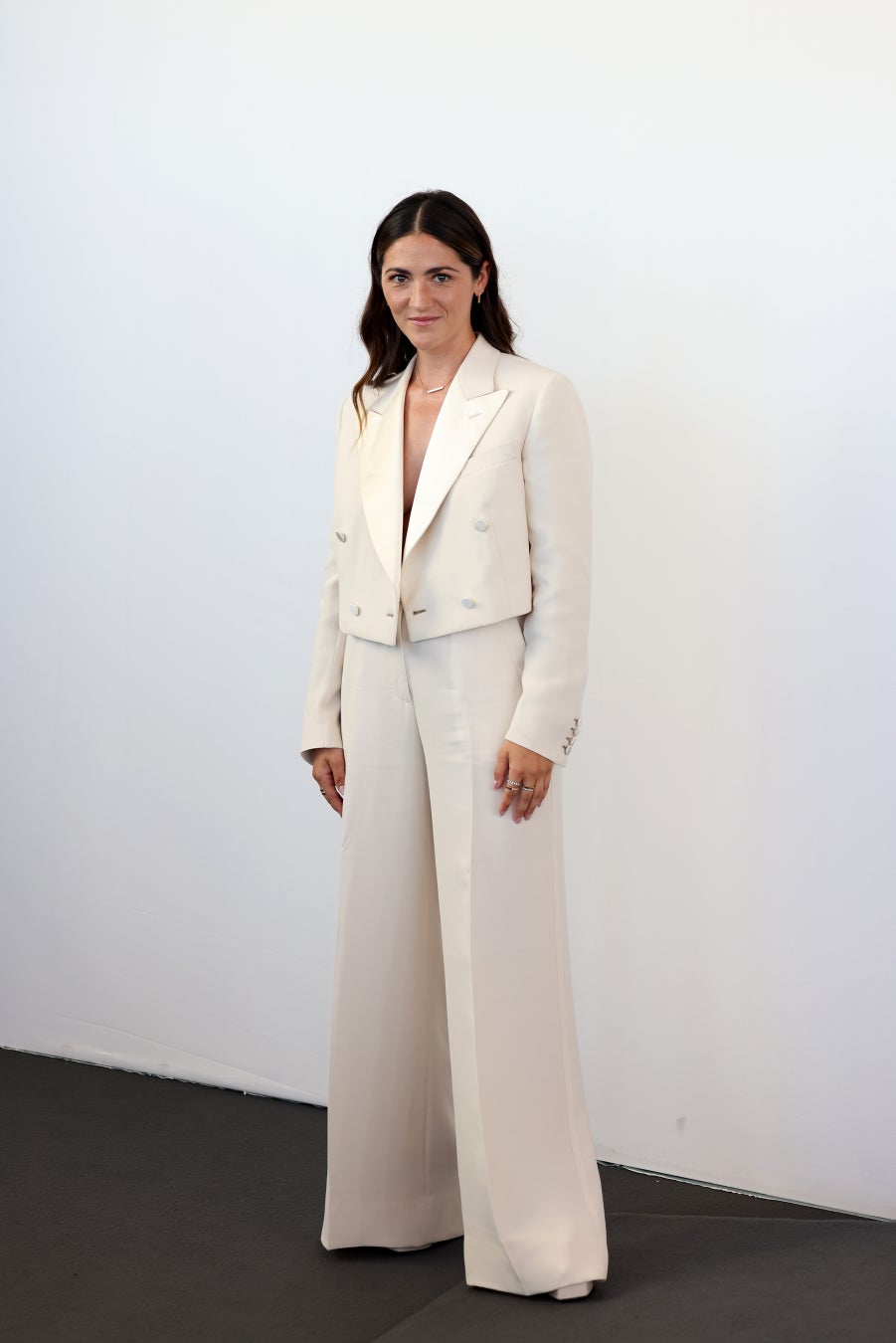女優のイザベル・ファーマンが、ブリオーニ・ラ・ドンナ・コレクションのシルクブレンドのアイボリークロップ丈ダブルブレスレットジャケットにワイドレッグトラウザーズを着用。