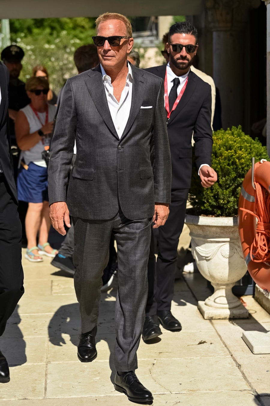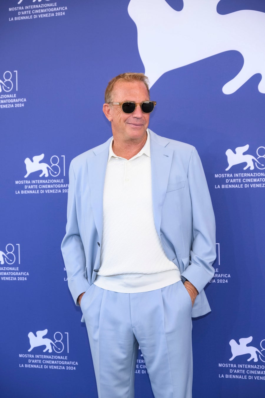 9月7日、ケビン・コスナーが、『Horizon: An American Saga(原題)』フォトコールにて淡いブルーのスーツ、ホワイトTramaポロシャツ、グレーのAppiaローファーシューズを着用。
