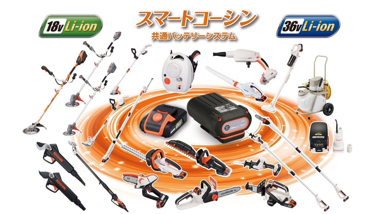 2017年よりバッテリーを共通で使用できる「スマートコーシンシリーズ」の充電式草刈機を販売開始し、今ではチェンソー、噴霧器、ポンプ、洗浄機、ブロワなど様々なガーデンツールをラインアップするまでになりました。今後更にバッテリー搭載商品の品揃えを増やしていく予定です。