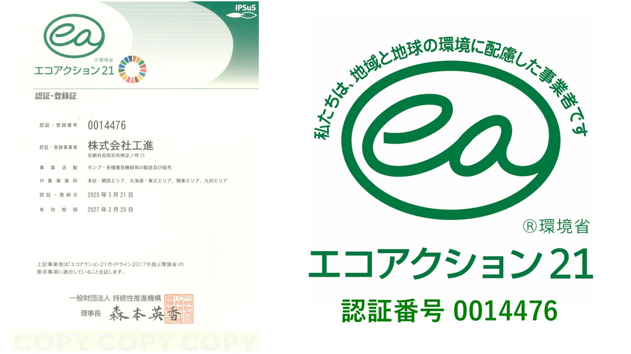 創業1948年以来、ポンプ、洗浄機、発電機、ポータブル電源などを開発・販売を展開する株式会社工進(本社:京都府⻑岡京市、代表取締役社⻑:⼩原英⼀)は、地球温暖化をはじめとする環境問題に積極的に取り組み、持続可能な社会の発展に寄与する為、2025年3月に環境省が策定した環境マネジメントシステムである「エコアクション21」の認証・登録証を取得いたしました。