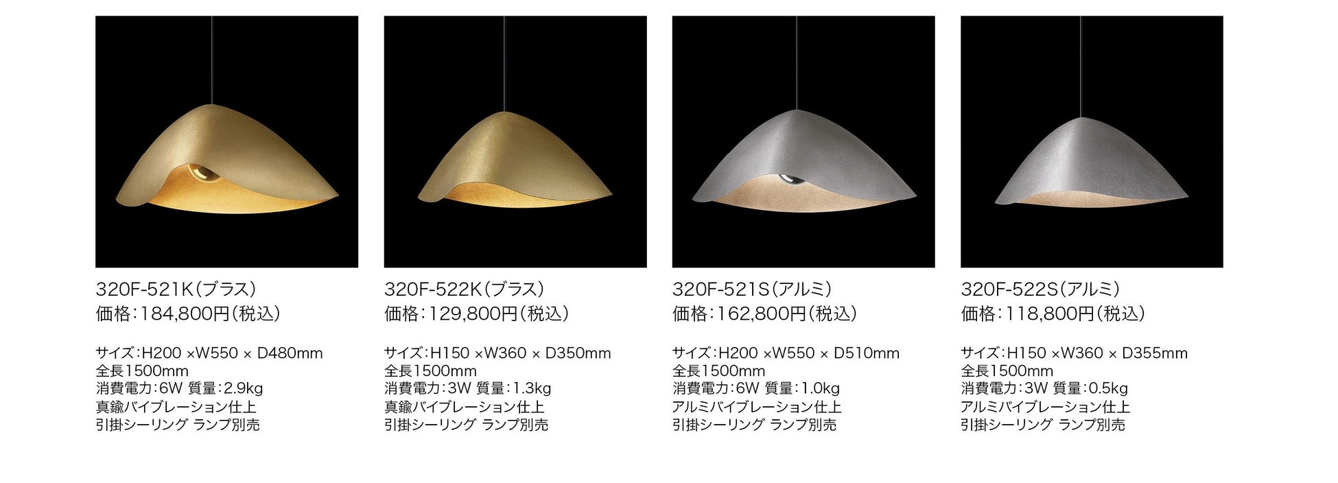 光がふんわりと浮かんでいる風景を思い浮かべてデザインされたペンダント照明。内側にくるんと巻いた独特のカーブは、逐次成形という特殊な製法により生まれたものです。逐次成形の力のバランスにより生まれる金属特有の曲がりを活かし、1 点1点僅かに異なる形となっています。三角錐形状は吊るす角度、そしてみる角度によって微妙に表情が異なります。表面のバイブレーション加工によって光が拡散します。とてもシンプルな器具でありながら吊るし方などで細やかな変化が生まれるようにデザインされています。