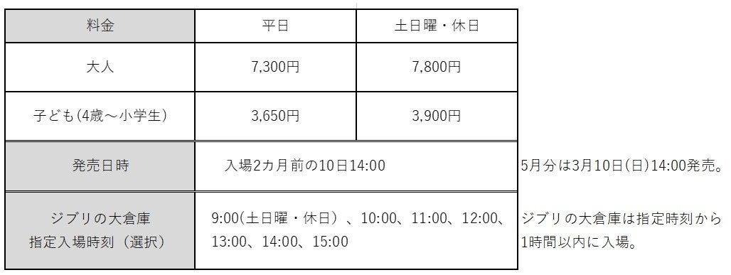 ※ジブリパーク指定の障害者手帳をお持ちの方と、同伴者1名は各券種の半額料金です。