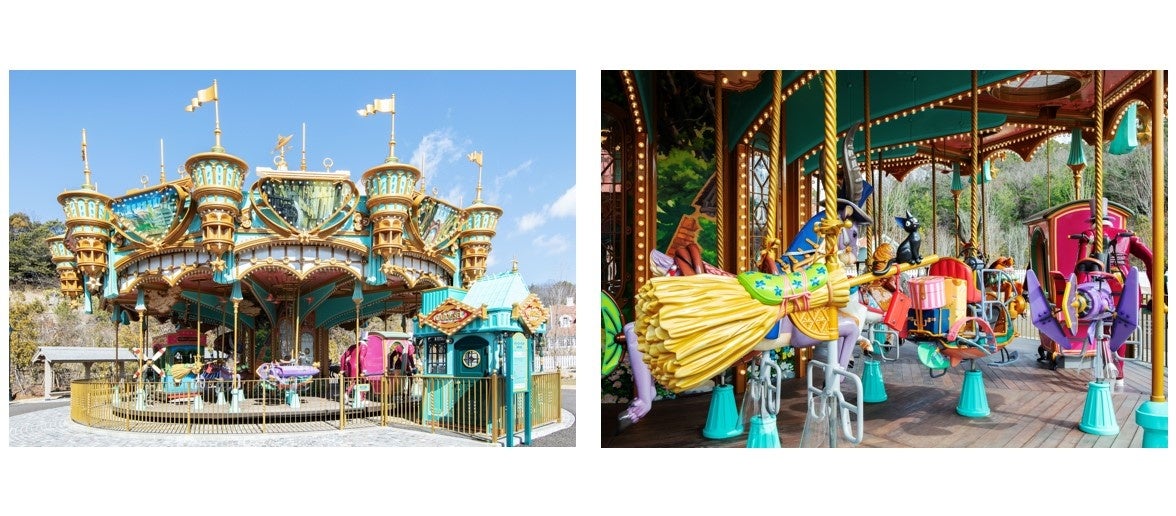「年に一度、村にやってくる移動遊園地」をイメージした乗り物遊具です。『魔女の宅急便』や『ハウルの動く城』、『もののけ姫』といった作品に登場する乗り物や動物・キャラクターをモチーフに装飾しています。屋根には『ハウルの動く城』のハウルとソフィーの装飾があり、乗車中は特別にアレンジされた同作品の背景音楽「人生のメリーゴーランド」が流れます。