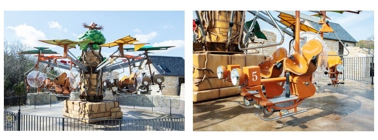 「年に一度、村にやってくる移動遊園地」をイメージした子ども向けの乗り物遊具で、「飛行機乗りの塔」に隣接しています。乗り物は『天空の城ラピュタ』の世界をモチーフにしています。フライングマシンの中心には、ラピュタとタイガーモス号があります。