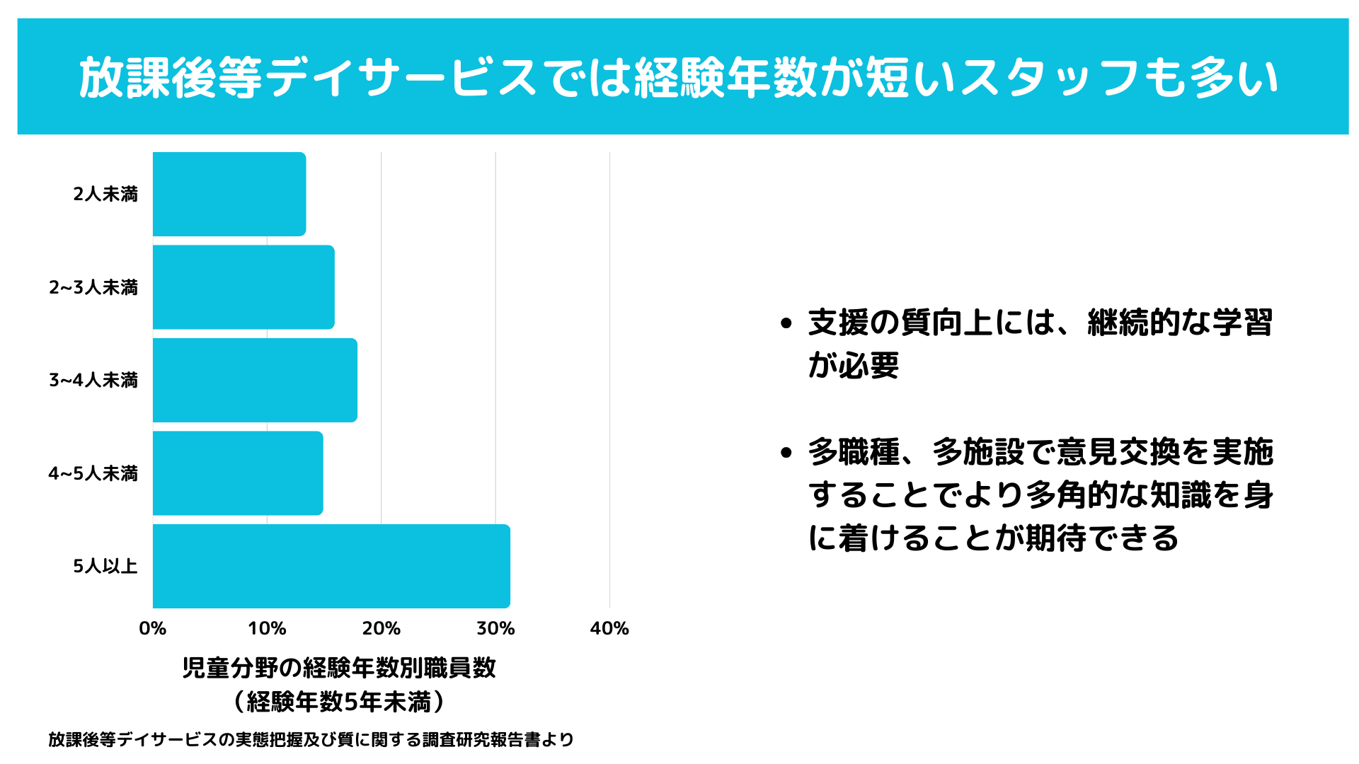 厚生労働省が公開した「放課後等デイサービスの実態把握及び質に関する調査研究報告書」によると、放課後等デイサービスの現場では、児童分野の経験年数が短い職員が大きい割合を占めています。お子様の障害や対応については千差万別であるため経験やそれを補う研修などが重要である一方、