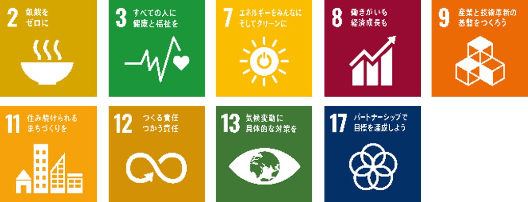 今回のご案内の取り組みは、SDGsの17のゴールのうち、特に2番、3番、7番、8番、9番、11番、12番、13番、17番に貢献するものと考えています。