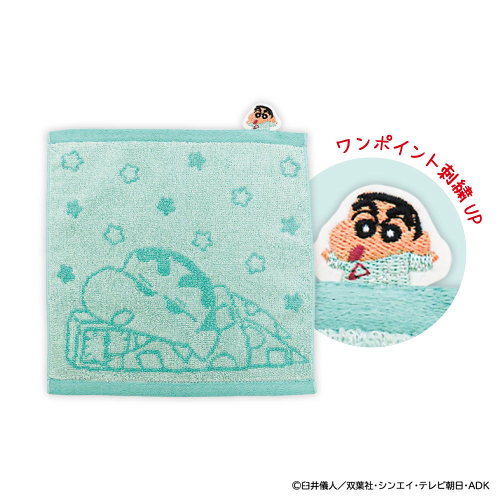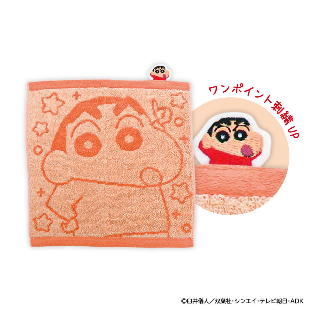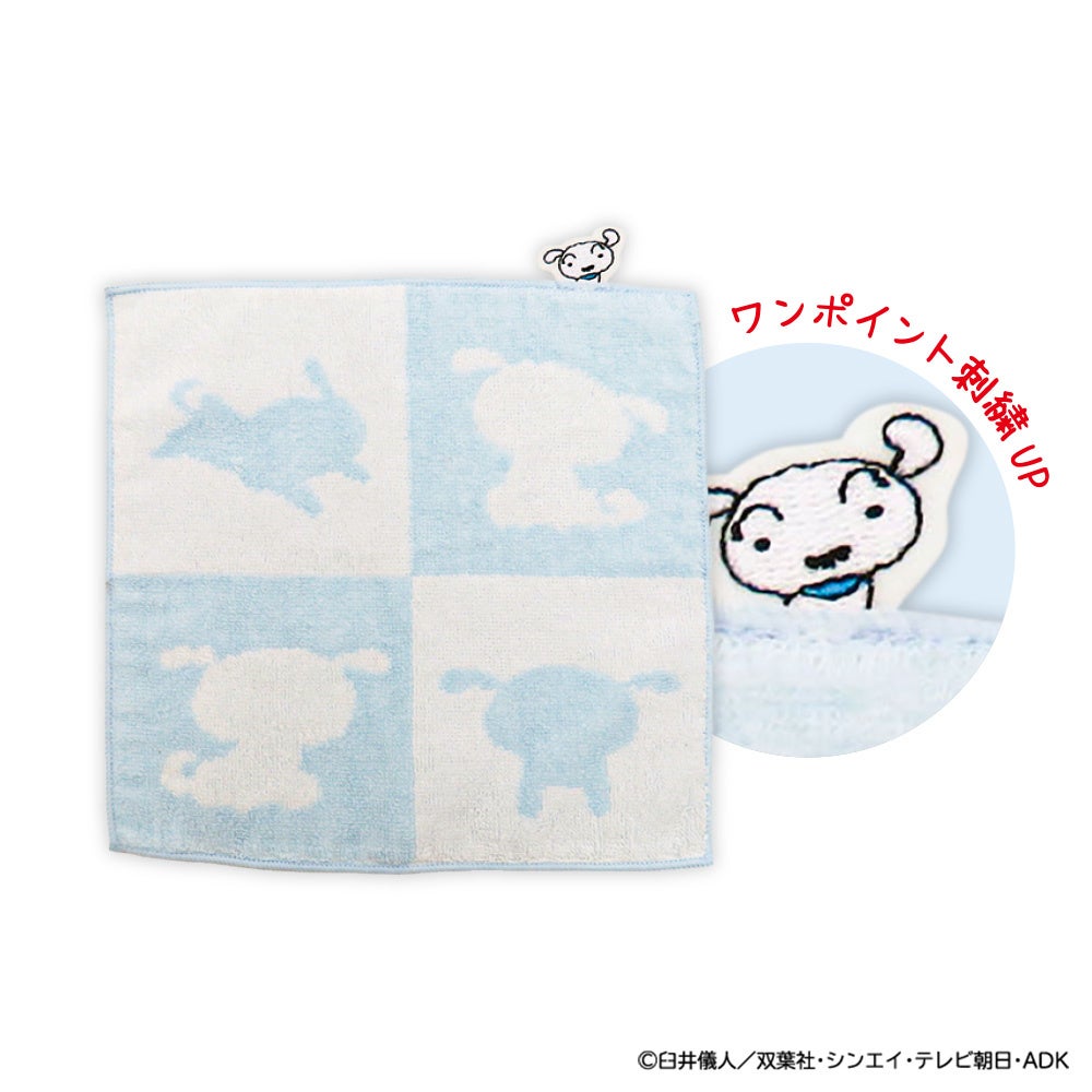ひょっこりミニタオルには「しんちゃん」と「シロ」がそれぞれひょっこり覗いているワンポイント刺繍付き。広げても折りたたんでもワンポイントが目立ってかわいいデザインです。