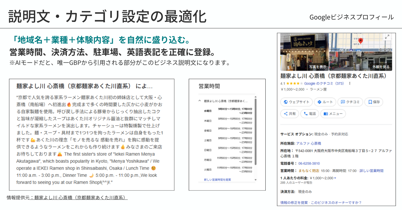 今年Googleに追加されたAIモードでは、Googleマップから引用されることも多く、これからWebでの集客対策を行ううえで注目すべきポイントです。