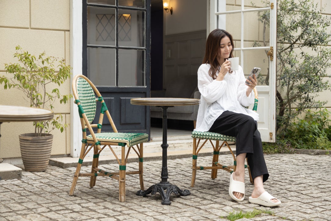 2023年夏のトレンドカラーの一つであるピンク。くすんだピンクが、足元を華やかに仕上げつつも主張しすぎないスタイリングを実現。